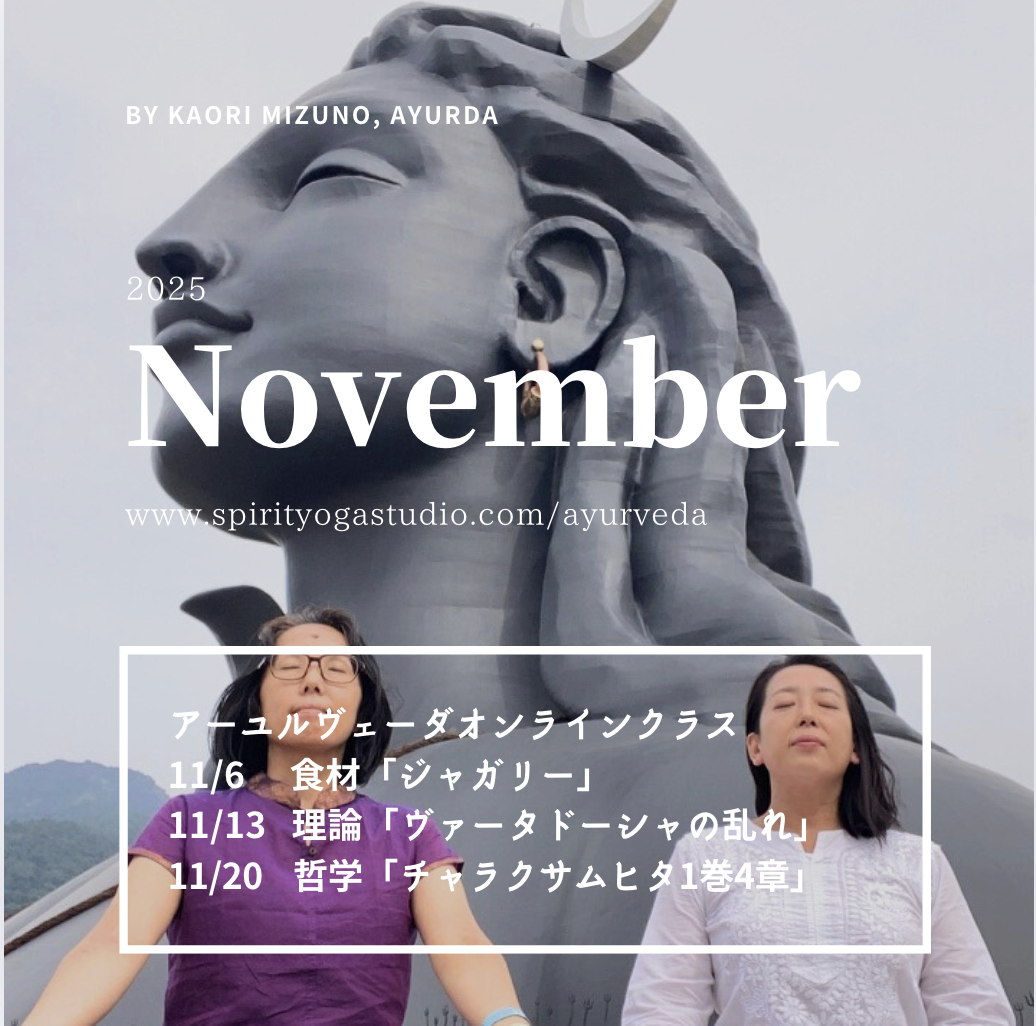 木曜日(月3回開催)20:00~21:00のアーユルヴェーダオンラインクラスでは、各週でテーマが変わります。