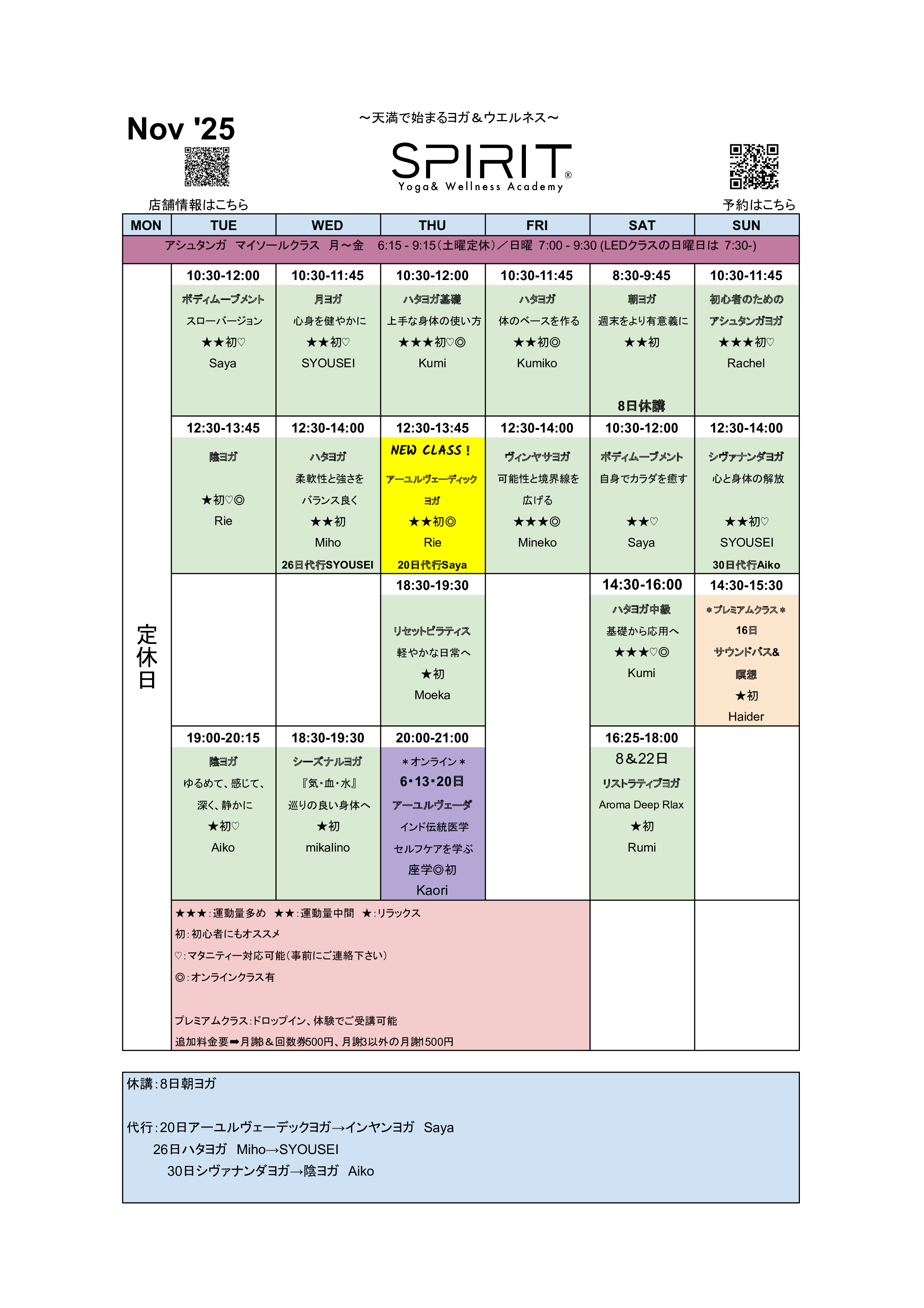 ・20日「アーユルヴェーデックヨガ」Rie→「インヤンヨガ」Saya(オンラインクラスはございません)