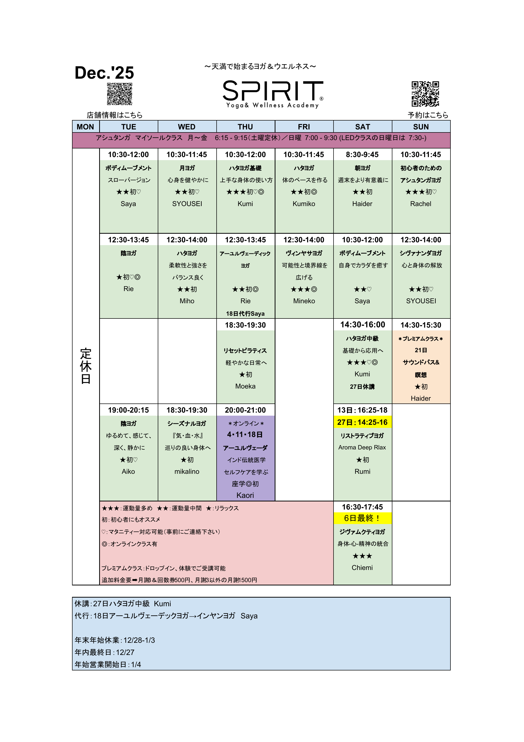 ・18日「アーユルヴェーデックヨガ」Rie→「インヤンヨガ」Saya(オンラインクラスはございません)